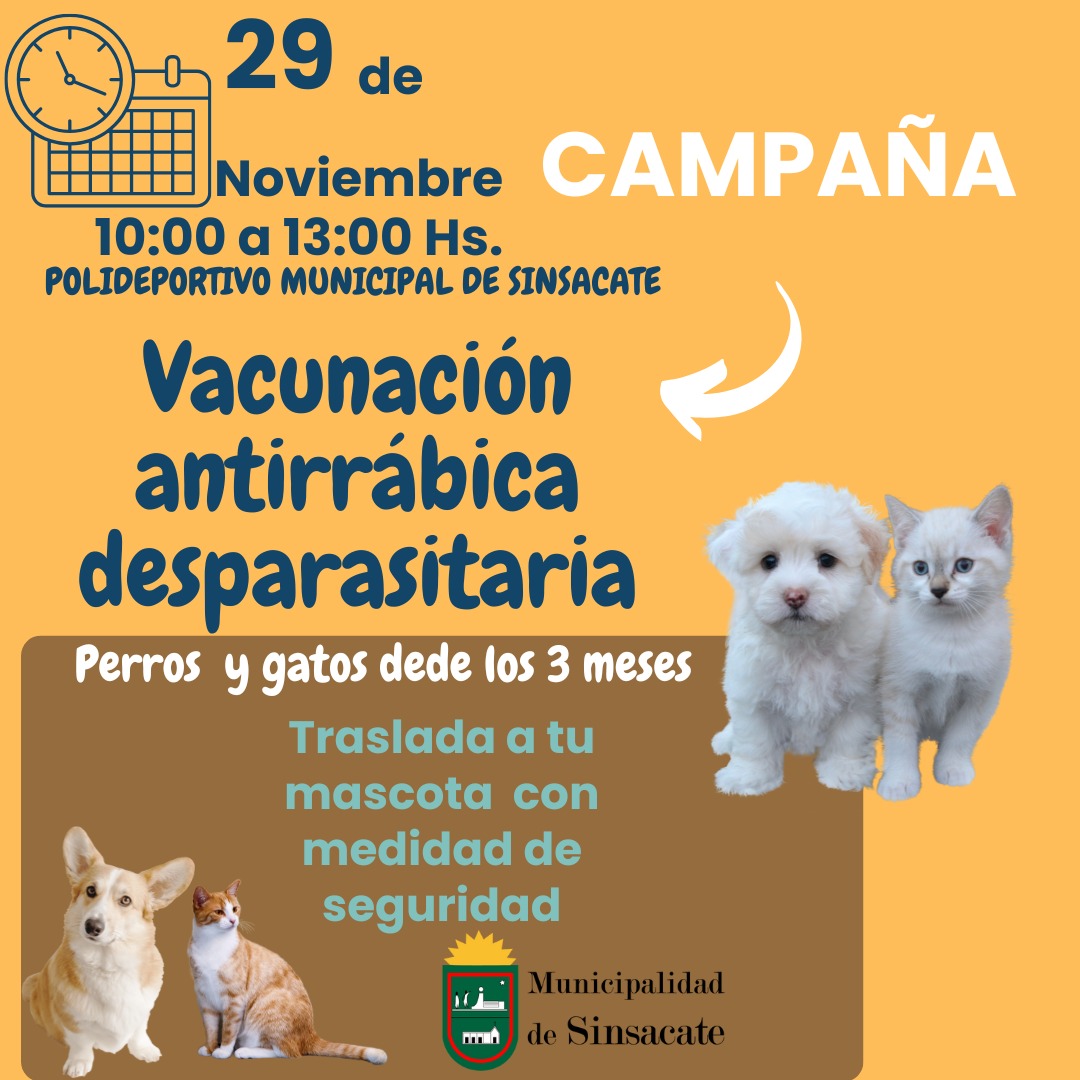 La Municipalidad de Sinsacate informa que habrá jornadas de *vacunación antirrábica y desparasitaria* para perros y gatos (desde los *3 meses*).