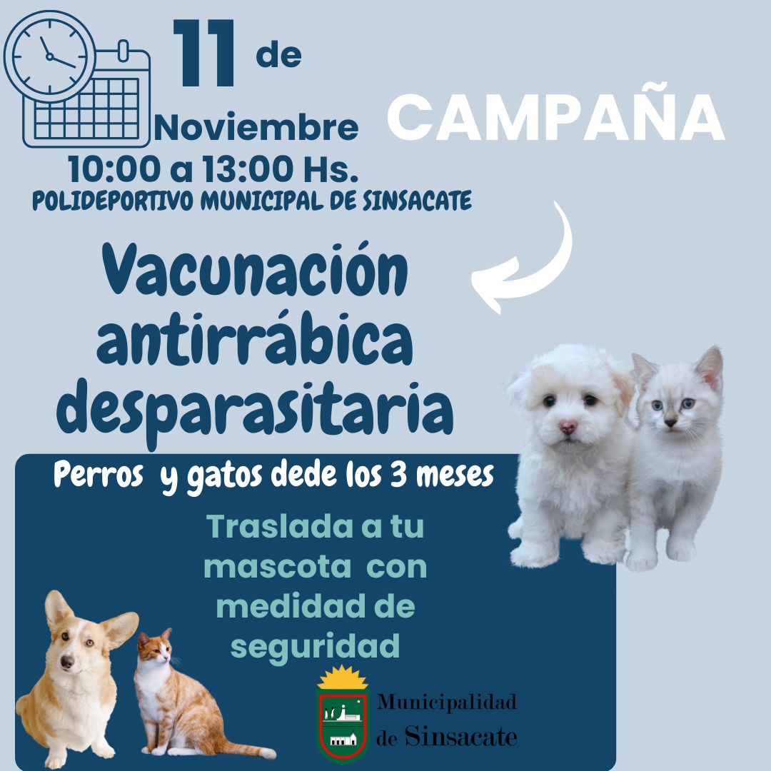 La Municipalidad de Sinsacate informa que habrá jornadas de *vacunación antirrábica y desparasitaria* para perros y gatos (desde los *3 meses*).
