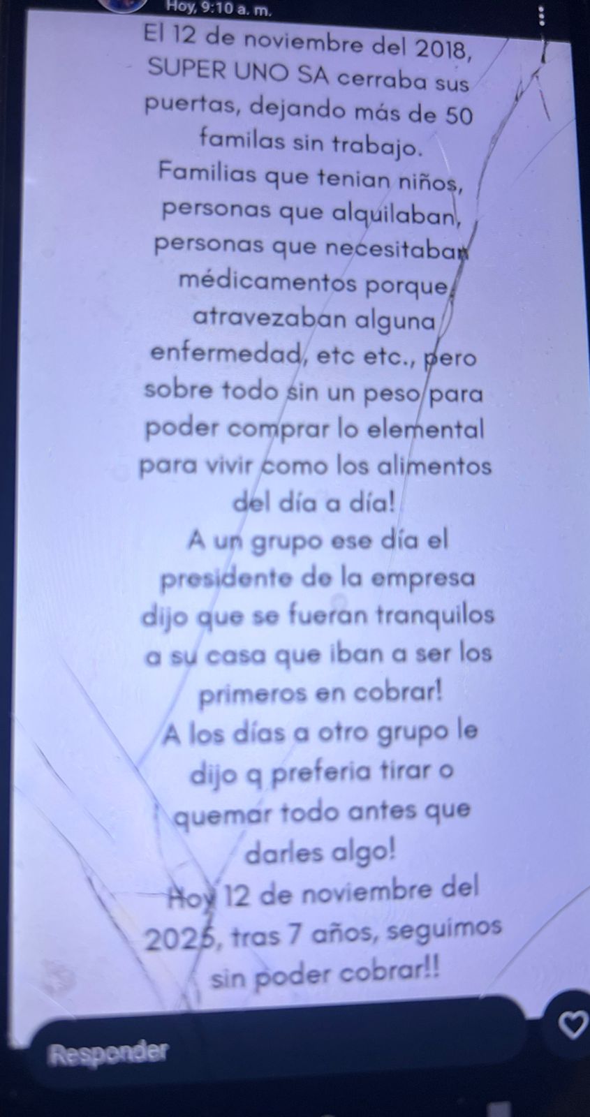 Ya pasaron siete años de la penosa noticia del cierre definitivo del SuperUno, centro comercial caroyense que dejó a decenas de trabajadores en la calle y sin cobrar sus sueldos. Monica, esposa de uno de los empleados hizo su descargo y dijo: