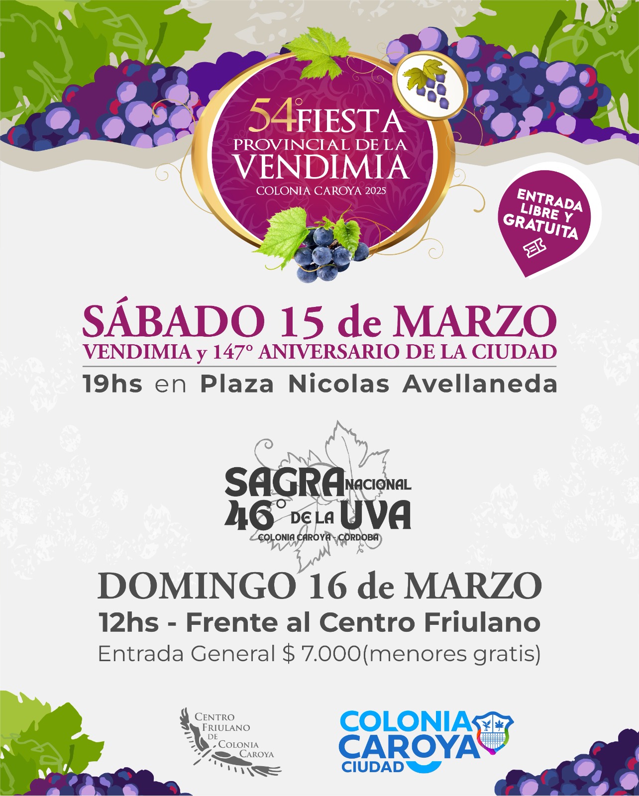 12:30. 46º Sagra Nacional de la Uva en Av. San Martín entre calles 26 y 30 de Colonia Caroya. Actuarán Rompe Coions, Furlan di Doman, el Coro Lidrîs, Martina Grión, Marcelo Lepore, Conjunto de Danzas Italianas “Alegrîe”, Ariel Villalba y su banda, Sendero Folk, Grito chaqueño y los Braidot y la tradicional Pisada de la Uva.