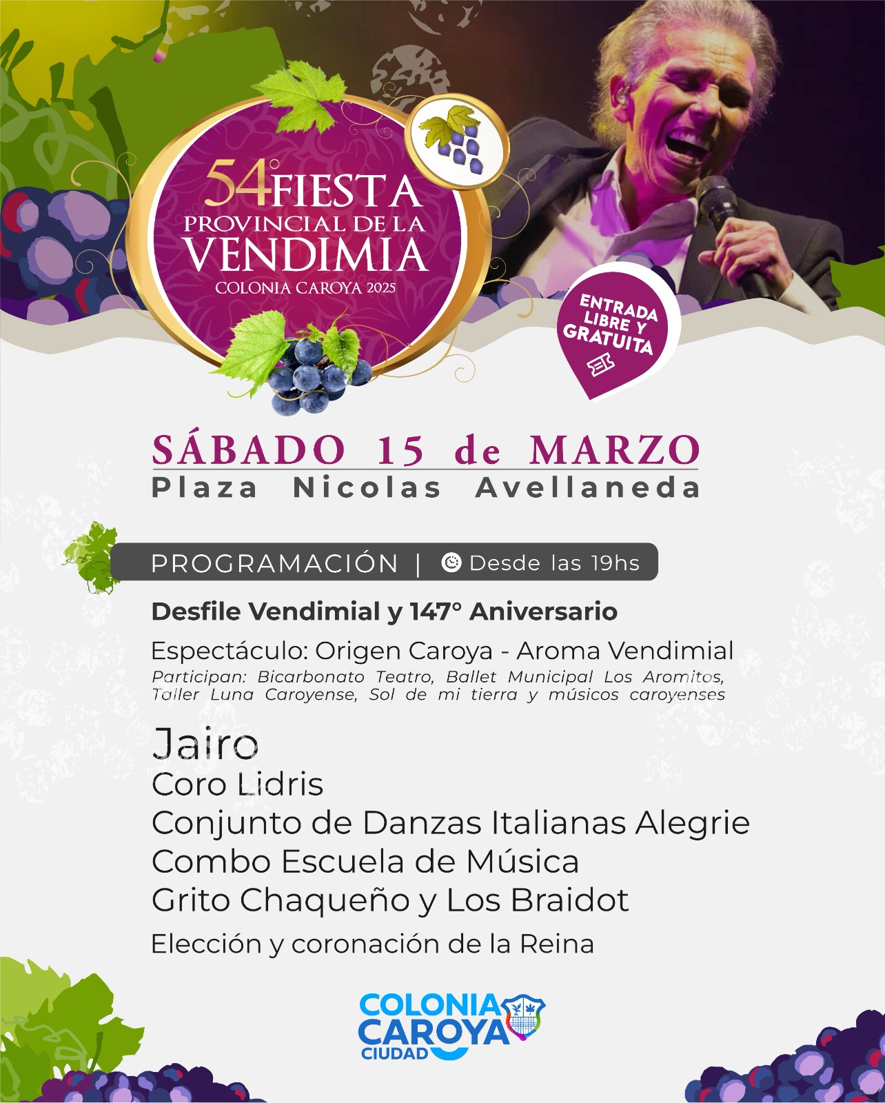 22:00. 54° Fiesta Provincial de la Vendimia en Plaza Nicolás Avellaneda. Se presentará el espectáculo “Origen Caroya -Aroma Vendimial”, con Bicarbonato Teatro, Ballet municipal Los Aromitos, Ballet Sol de mi Tierra, Taller Luna Caroyense y músicos locales: actuarán el Coro Lidrîs, el Conjunto de Danzas Italianas “Alegrîe”, la Escuela de Música, “Grito chaqueño y los Braidot” (desde Avellaneda) y Jairo.