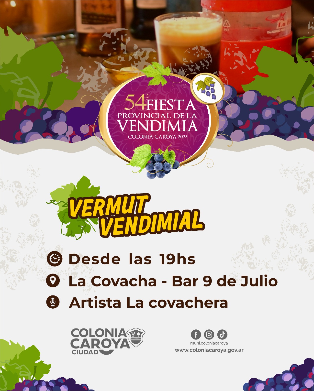 19:30. La Hora del Vermú Vendimial en La Covacha y Bar 9 de Julio con la presentación de La Covachera. Será sobre calle Bonoris Sur.