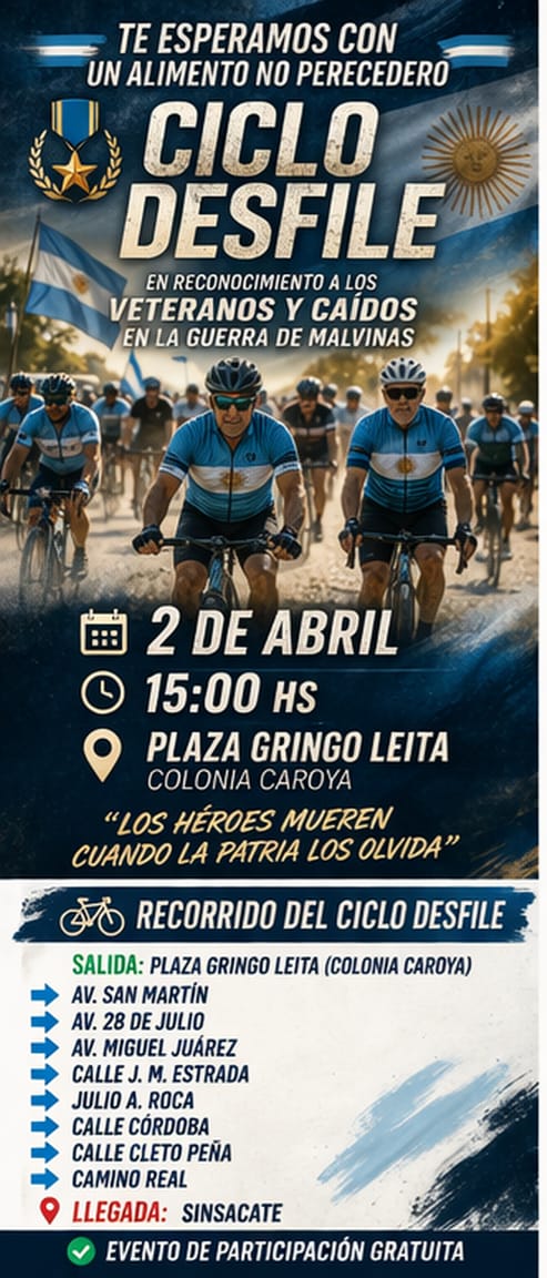 Posteriormente, comenzará el tradicional Ciclo-Desfile, que recorrerá Av. San Martín, Av. 28 de Julio, Av. Miguel Juárez, calles céntricas de Jesús María y el Camino Real hasta llegar a Sinsacate, homenajeando a los héroes de la Guerra de 1982.