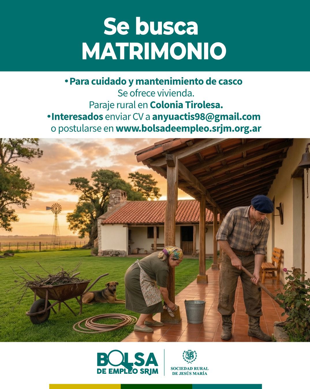 👉 Interesados enviar CV a [email protected] o postularse en https://bolsadeempleo.srjm.org.ar/trabajo/se-busca-matrimonio/