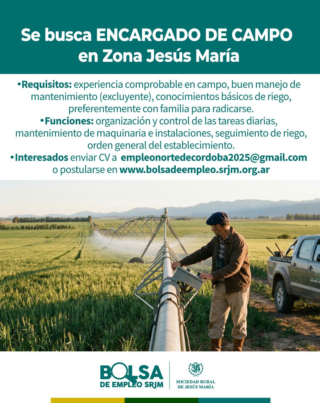 👉 Interesados enviar CV a [email protected] o postularse en https://bolsadeempleo.srjm.org.ar/trabajo/se-busca-encargado-de-campo-en-zona-jesus-maria/