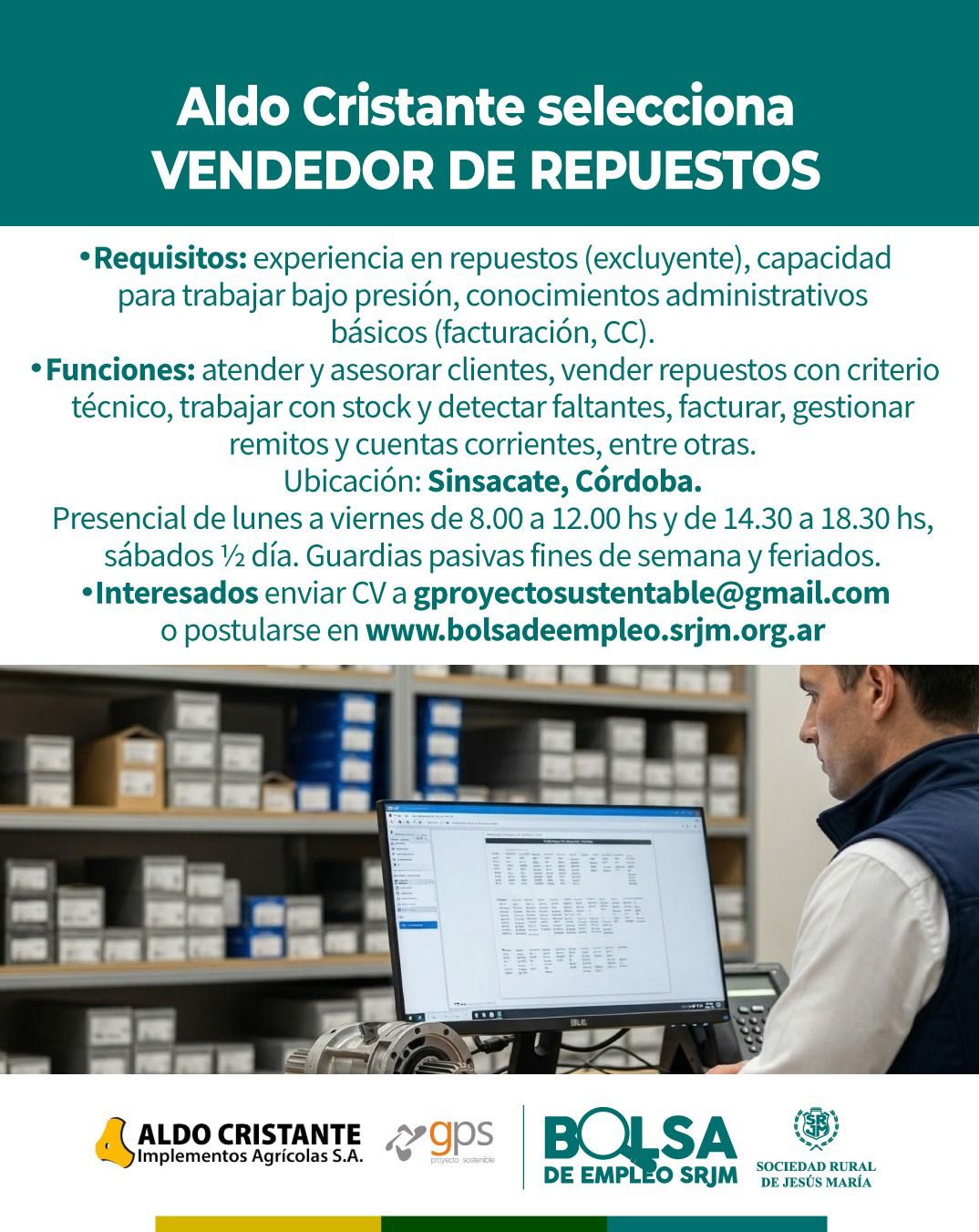👉 Interesados enviar CV a [email protected] o postularse en https://bolsadeempleo.srjm.org.ar/trabajo/aldo-cristante-selecciona-vendedor-de-repuestos/