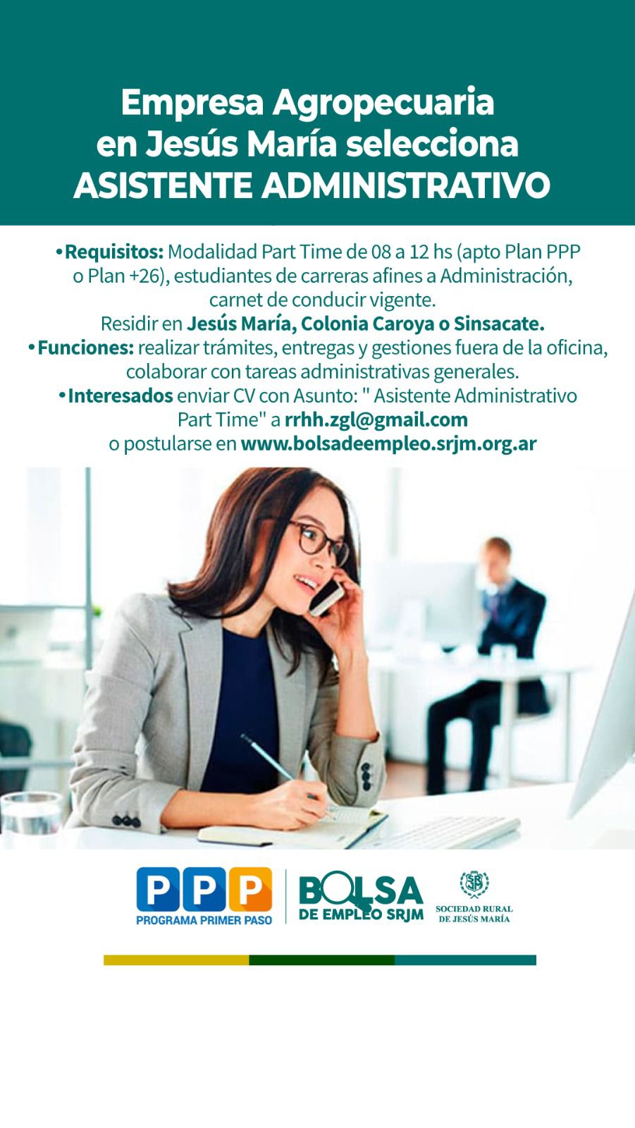 Interesados enviar CV con Asunto: » Asistente Administrativo Part Time» a [email protected] o postularse en https://bolsadeempleo.srjm.org.ar/trabajo/empresa-agropecuaria-en-jesus-maria-selecciona-asistente-administrativo/