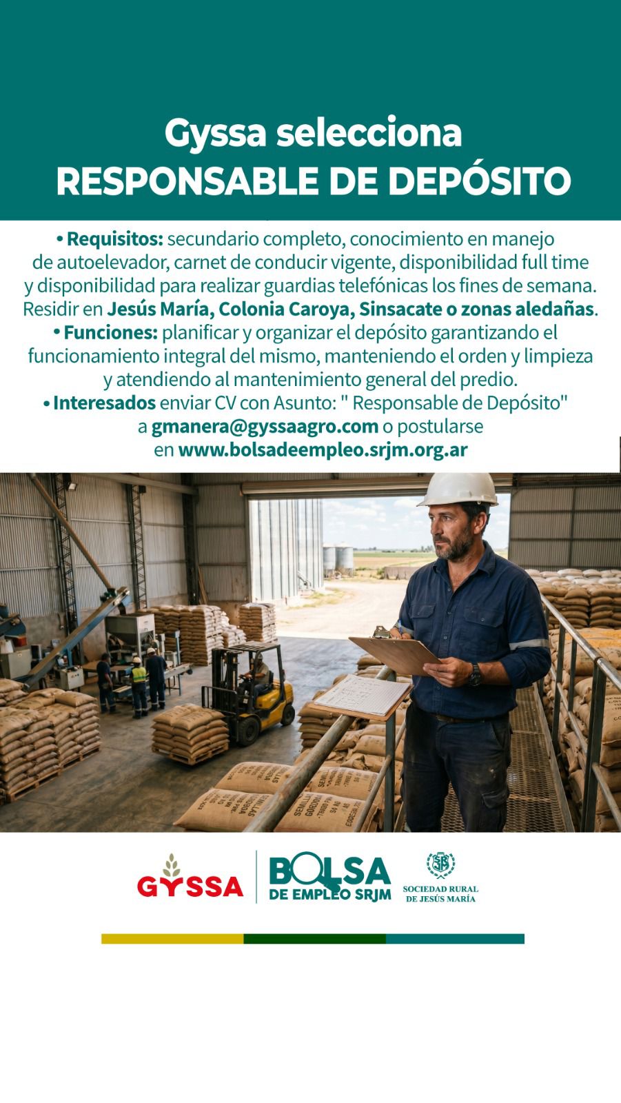 Interesados enviar CV con Asunto: » Responsable de Depósito» a [email protected] o postularse en https://bolsadeempleo.srjm.org.ar/trabajo/gyssa-selecciona-responsable-de-deposito/