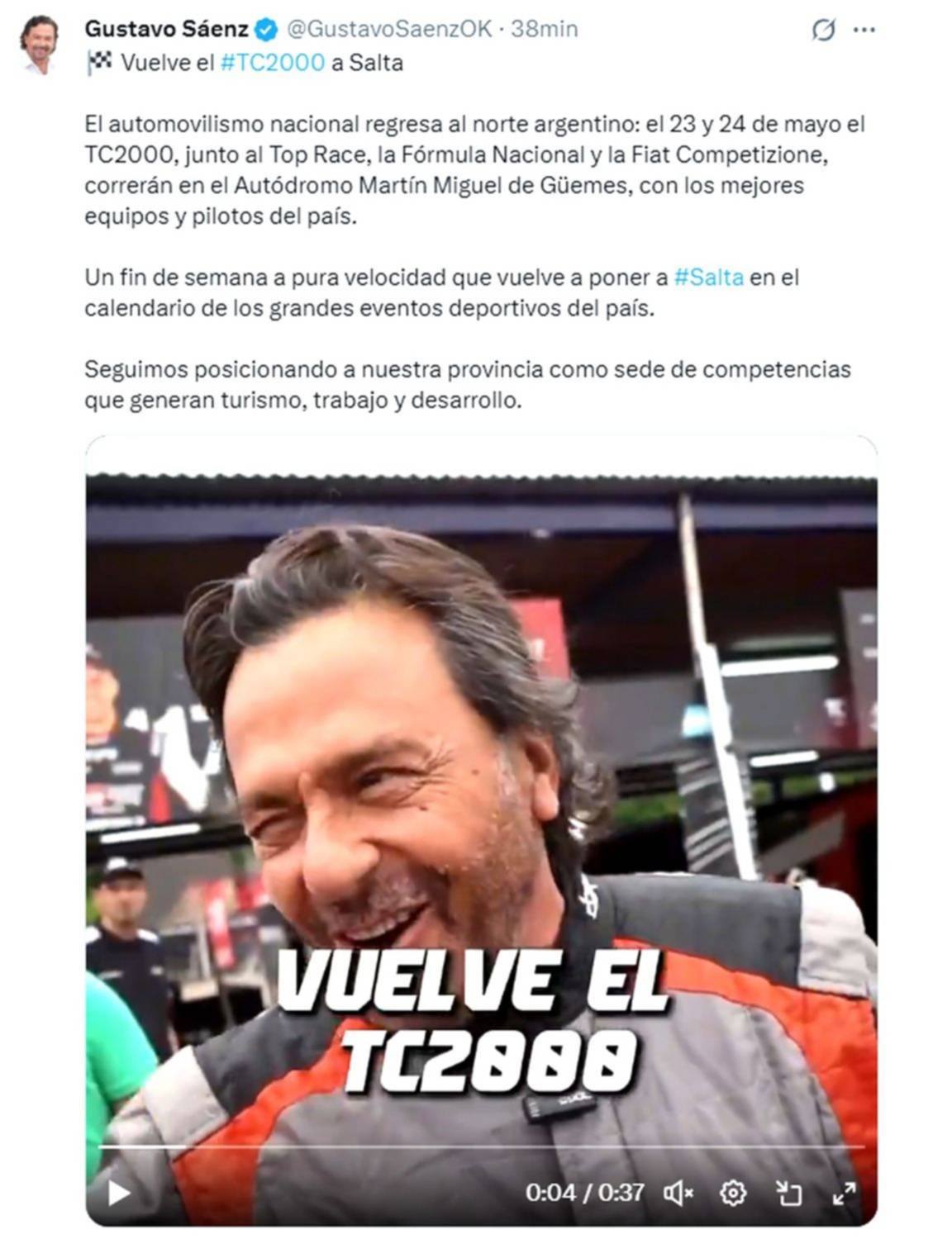 A través de sus redes sociales, el gobernador Gustavo Sáenz anunció que la fecha contará también con la participación de las categorías Top Race, Fórmula Nacional y Fiat Competizione, lo que anticipa un fin de semana “a pura velocidad” con los principales equipos y pilotos del país.