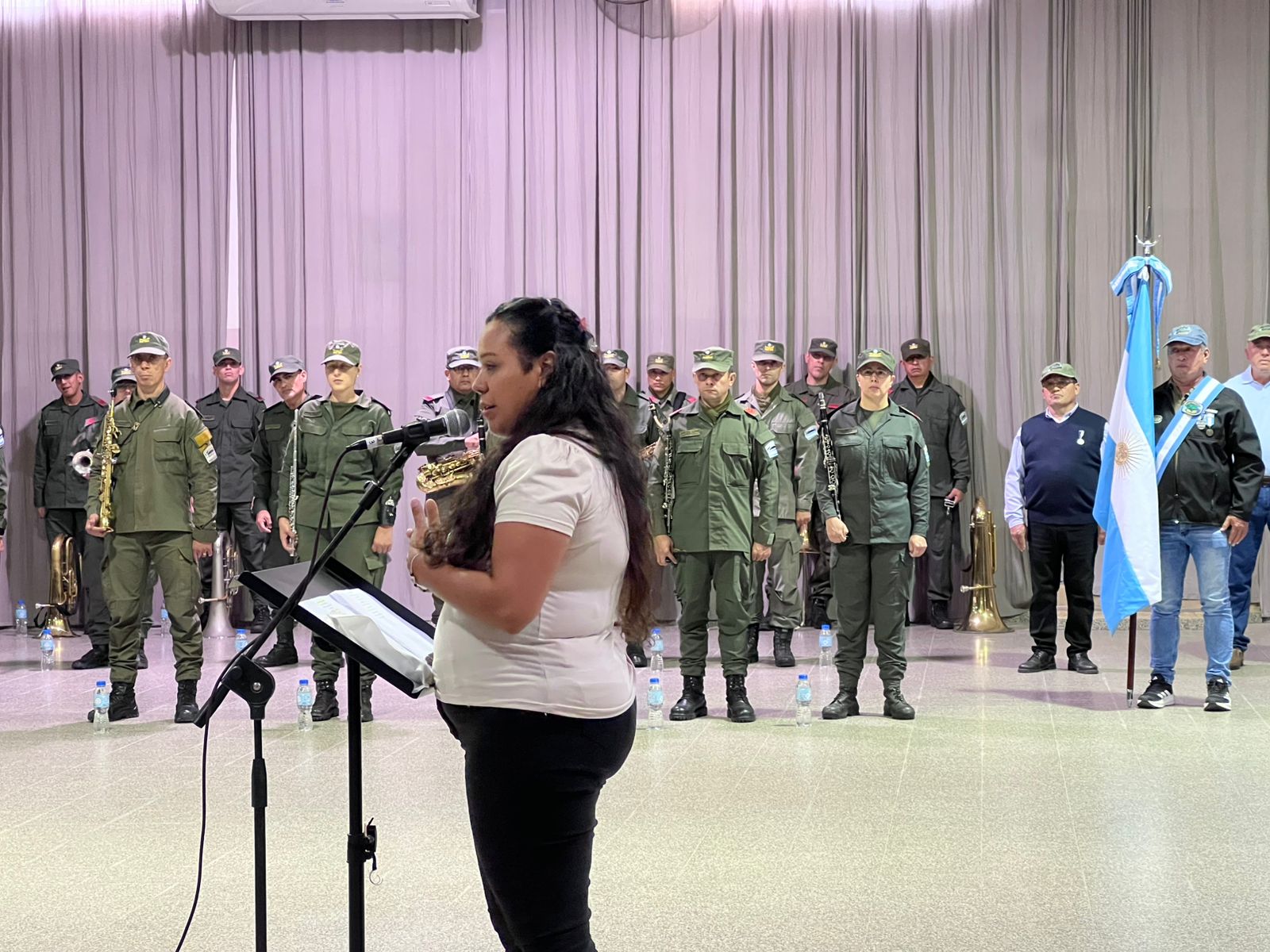 La ceremonia estuvo marcada por momentos de profundo respeto y reflexión. En este marco, la artista Carmen Moyano ofreció palabras cargadas de emoción, en las que subrayó la importancia de sostener la memoria colectiva como herramienta fundamental para no olvidar a quienes dieron todo por la patria.