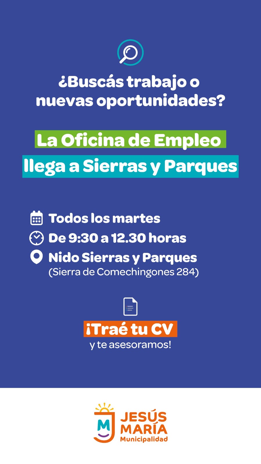 La Municipalidad de Jesús María, a través de la Agencia de Desarrollo Económico, informa que la Oficina de Empleo comenzará a prestar atención en barrio Sierras y Parques, con el objetivo de acercar sus servicios a uno de los sectores más poblados de la ciudad.