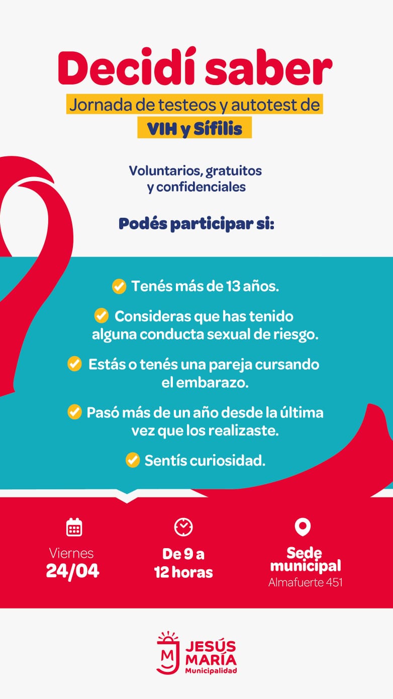 La Municipalidad de Jesús María llevará adelante una nueva jornada de testeo rápido para la detección de VIH y sífilis, destinada a vecinos que deseen acceder a controles de salud de manera segura y gratuita.