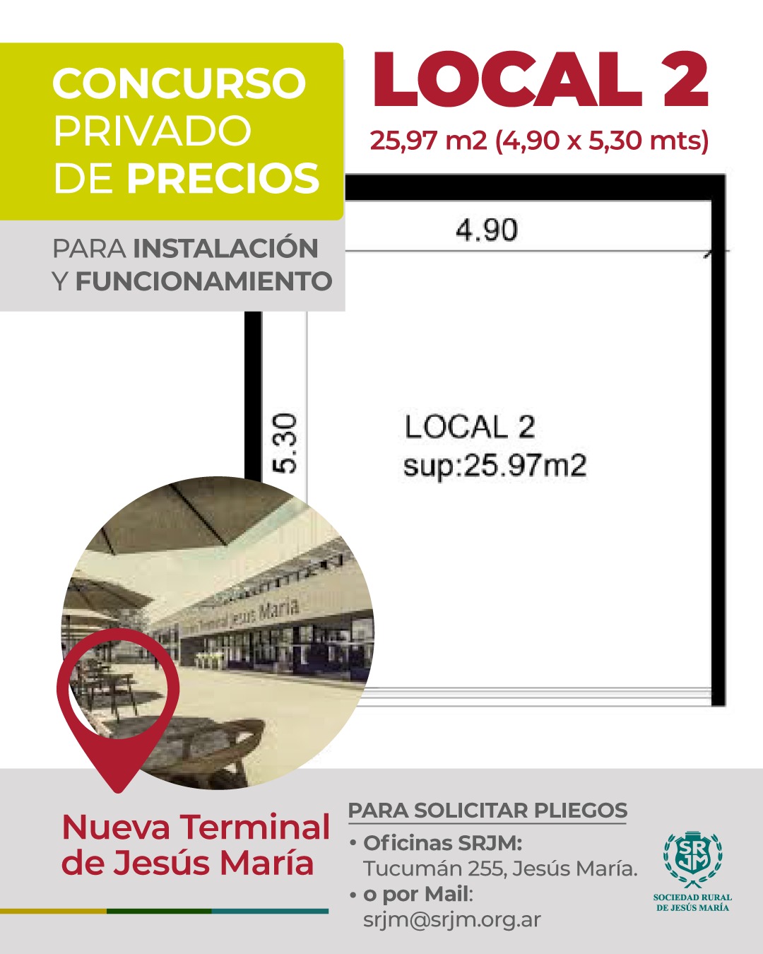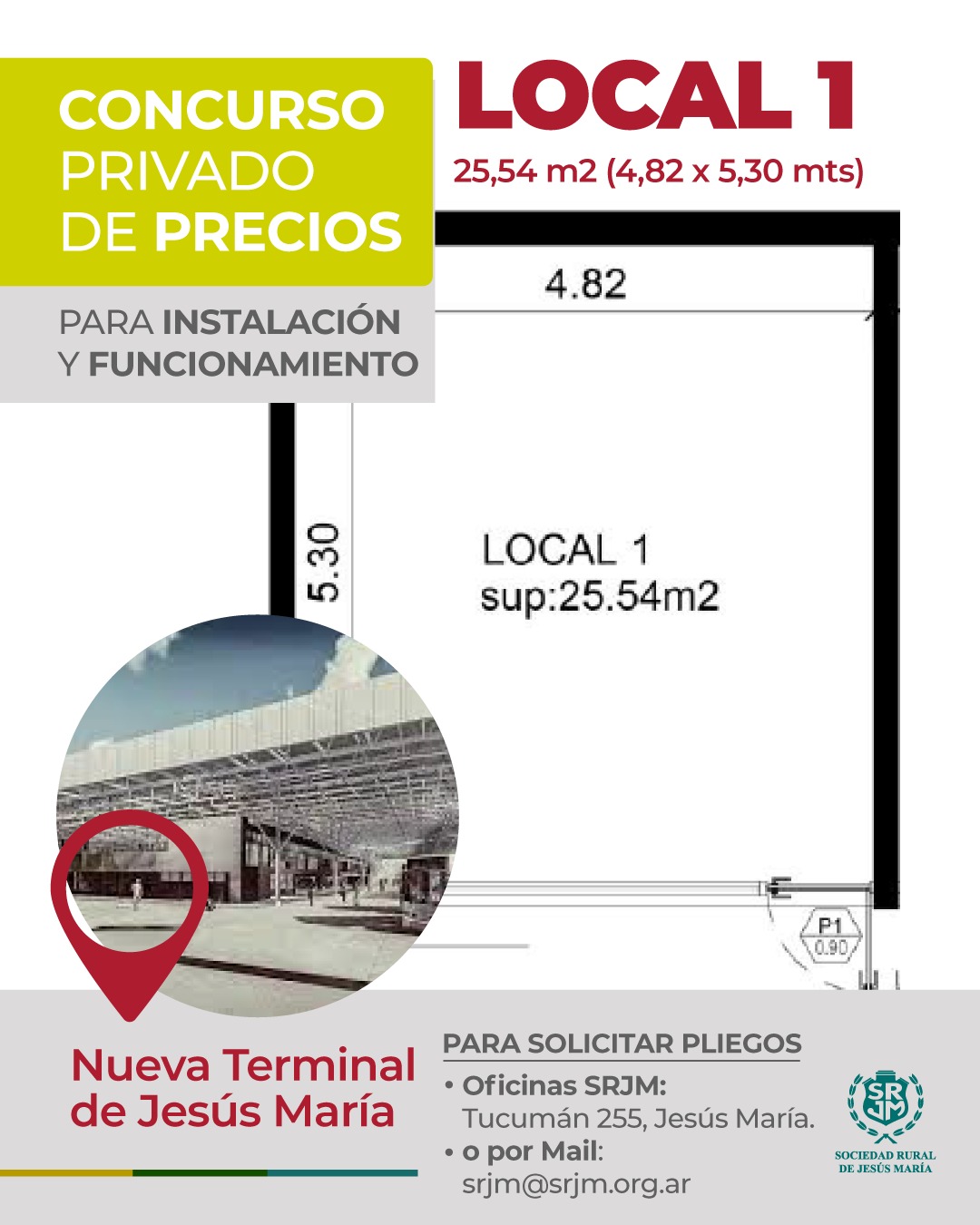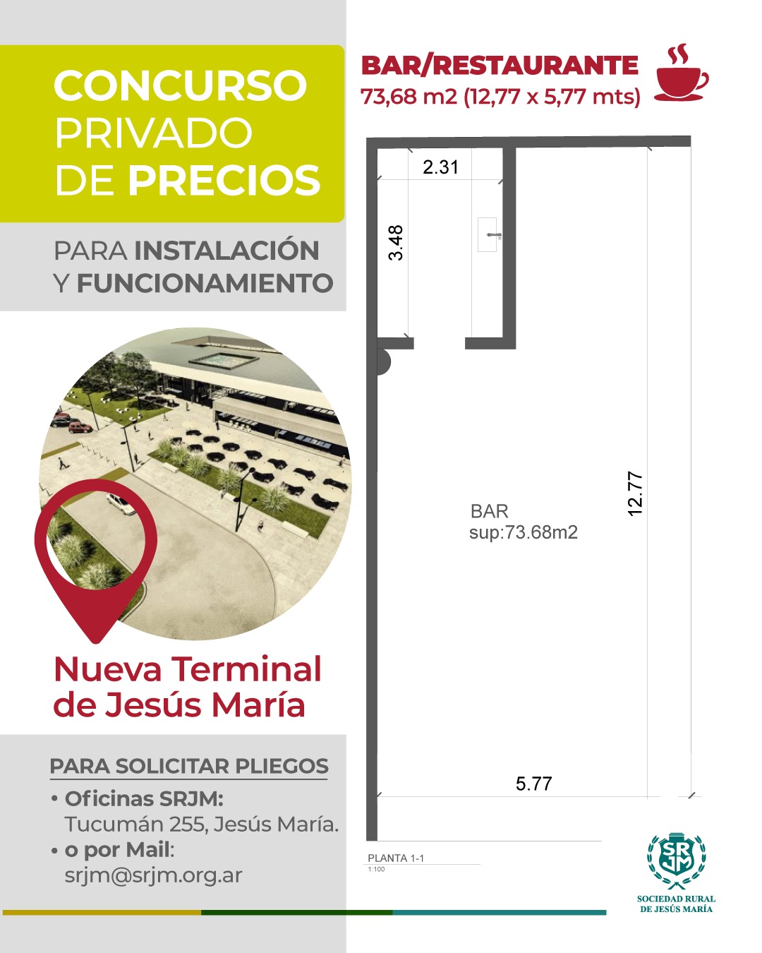La Sociedad Rural de Jesús María llama a concurso privado de precios para locación comercial para instalación y funcionamiento de: Bar/Restaurante, Local 1 y Local 2 en la nueva Terminal de Jesús María.