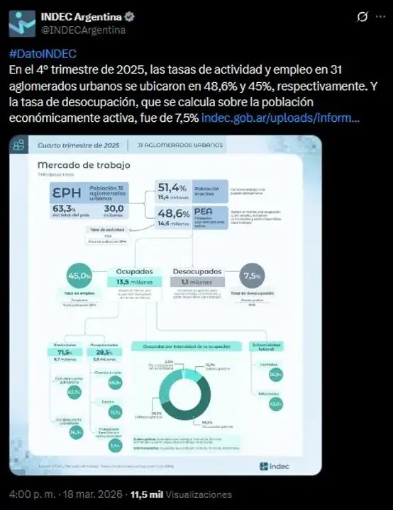 En sus comunicaciones semanales vía redes sociales, el INDEC explicó en su publicación en X que “en el 4.º trimestre de 2025, las tasas de actividad y empleo en 31 aglomerados urbanos se ubicaron en 48,6% y 45%, respectivamente. Y la tasa de desocupación, que se calcula sobre la población económicamente activa, fue de 7,5%”.
